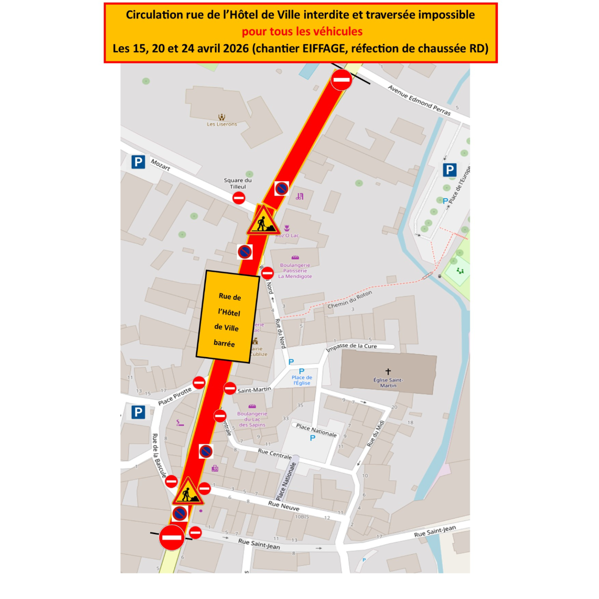 Réfection de chaussée : circulation interdite Rue de l'Hôtel de Ville et traversée impossible.