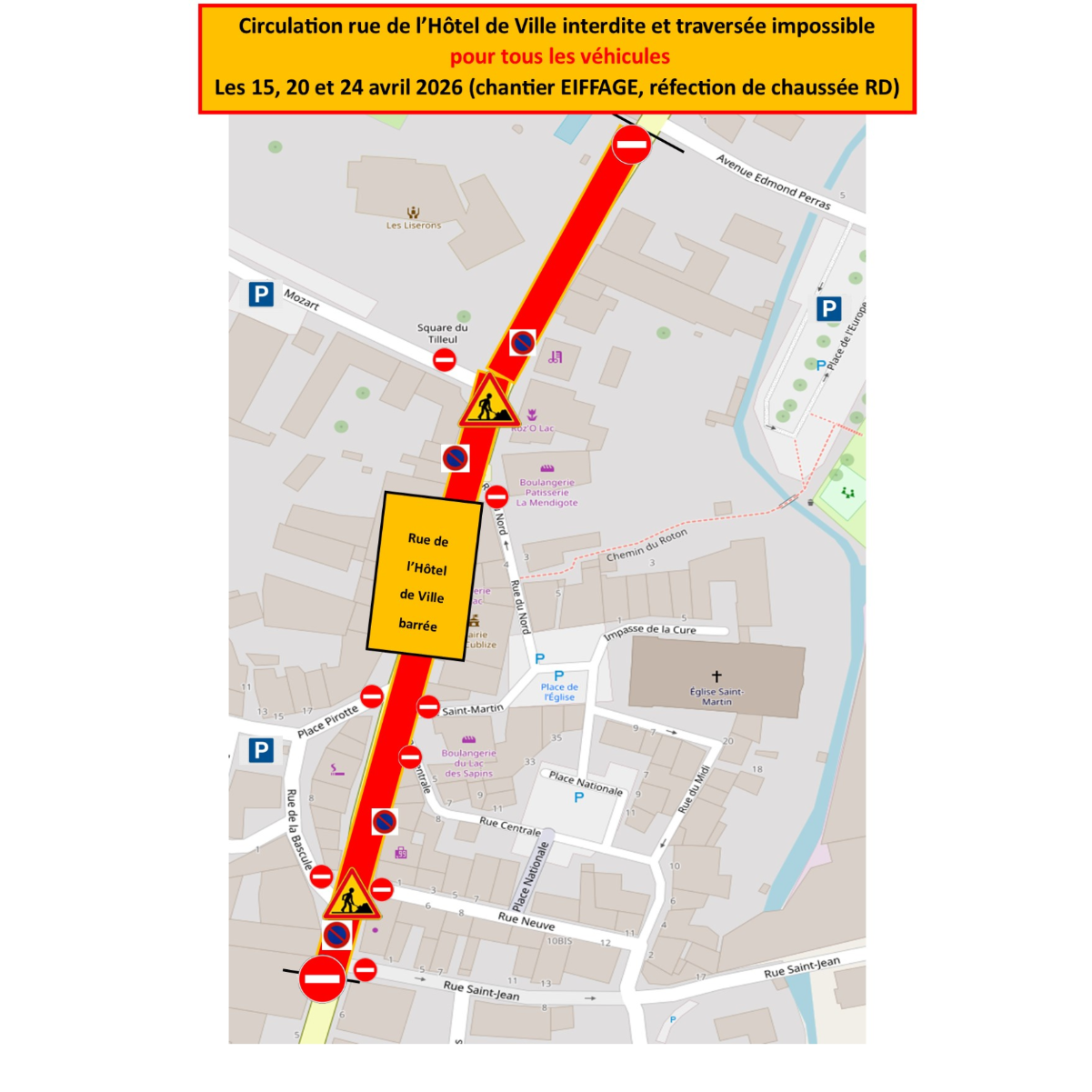 Réfection de chaussée : circulation interdite Rue de l'Hôtel de Ville et traversée impossible.